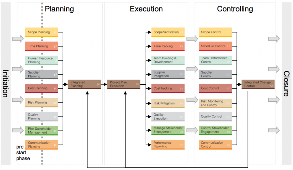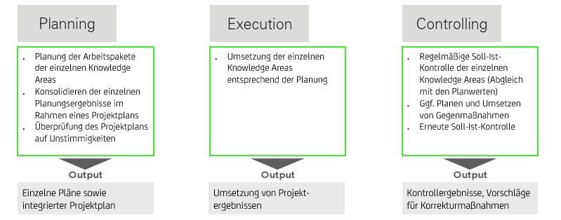 - Die Prozesse Planning, Execution und Control werden im Rahmen der Realisierung eines Projektes iterativ für jede Knowledge Area durchgeführt.